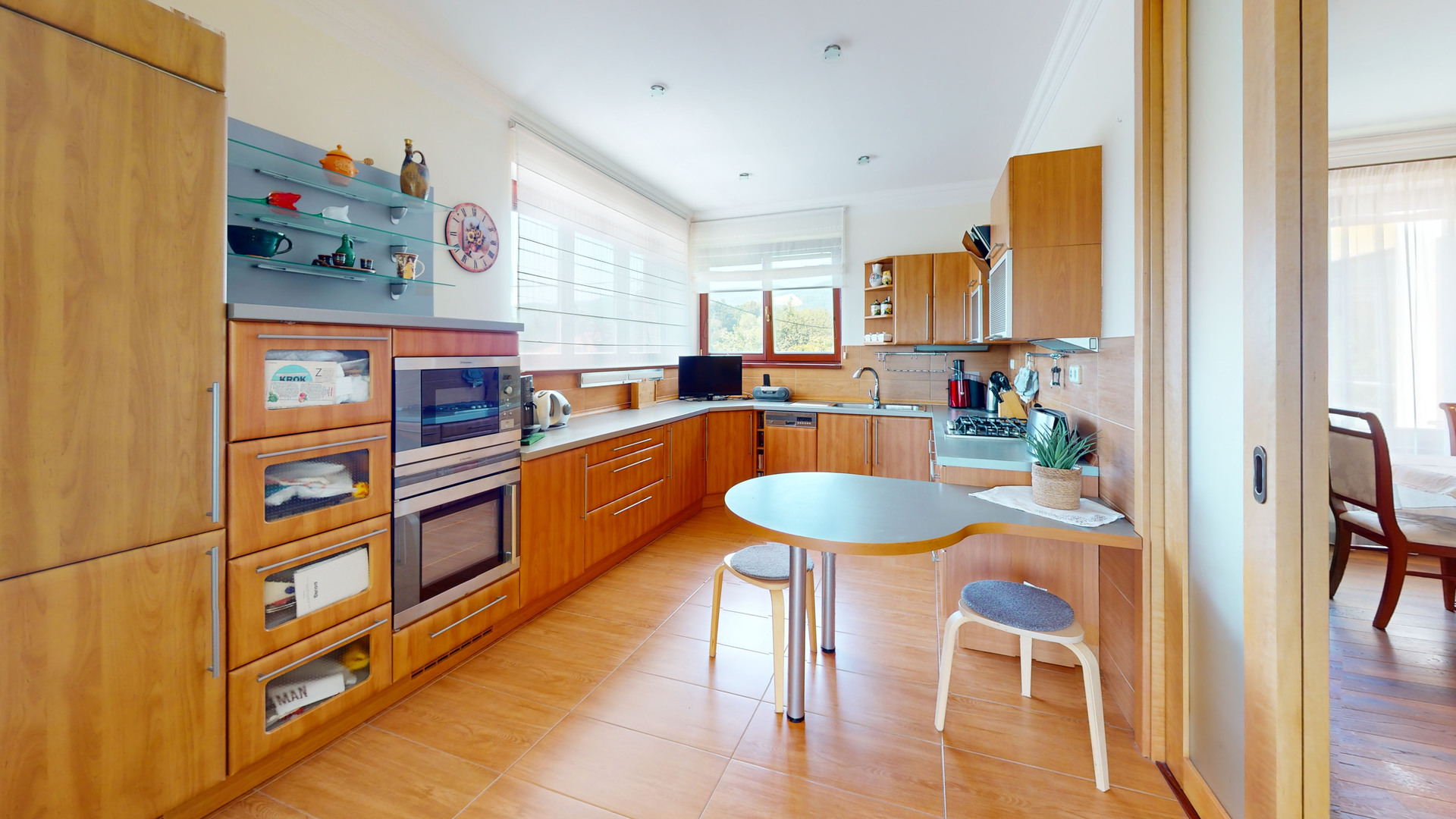 Vila ponúka šesť izieb, tri kúpeľne, tri terasy a dve pracovne. Vysoké stropy, presklené steny a panoramatické výhľady nielen do záhrady, ale aj na okolité obce pod Strážovskými vrchmi, vytvárajú vzdušný a otvorený interiér. Vyvýšená pozícia domu nad Malinovou prináša viac svetla, pokoja a lepší výhľad na krajinu. Denná časť domu plynulo prechádza do nočnej, v suteréne sa nachádza dvojgaráž a technické miestnosti. Vila sa predáva kompletne zariadená – s autentickým štýlom a harmóniou.