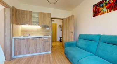 Dispozícia apartmánu zahŕňa vstupnú chodbu, kúpeľňu so sprchovacím kútom a WC, obývaciu izbu spojenú s kuchynským kútom, samostatnú spálňu a balkón s výhľadom na okolitý les. Apartmán je bez tiarch a predáva sa kompletne zariadený. Využívať ho môžete pre vlastné potreby, alebo sa zapojiť do vyťažovacieho programu apartmánového domu Štiavnica, ktorý sa stará o prenájom a správu nehnuteľnosti.