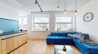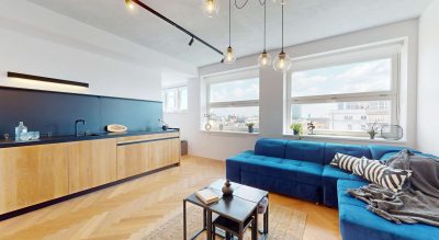 Veľké presklené plochy zabezpečujú dostatok denného svetla a ponúkajú nádherný výhľad na Bratislavský Downtown, čo bytu dodáva jedinečný mestský charakter.