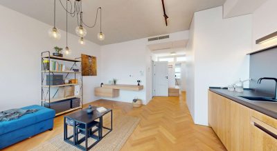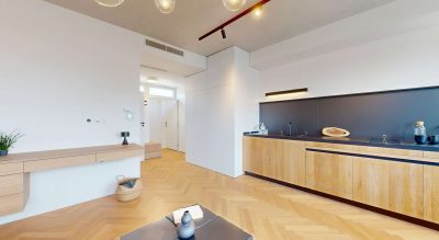 Byt je kompletne zariadený a pripravený na okamžité nasťahovanie. Interiér je ladený v nadčasovom dizajne s dôrazom na kvalitné materiály. K výbave patrí podlahové kúrenie, ktoré zabezpečuje príjemný tepelný komfort počas chladnejších mesiacov, a zabudované chladenie pre pohodlie počas leta. Obývacia časť ponúka rozťahovací gauč, ktorý môže slúžiť aj ako pohodlné lôžko pre návštevy. Praktickým doplnkom je aj rozkladací stôl so stoličkami, ktorý je šikovne ukrytý, aby v byte zostal dostatok priestoru.