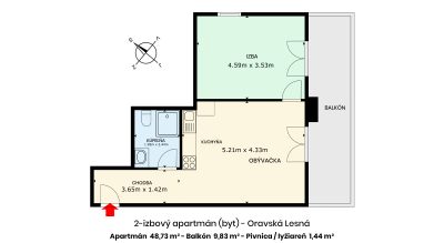 Podlahová plocha apartmánu je 48,73 m², balkón má výmeru 9,83 m² a k nehnuteľnosti prislúcha aj kobka / lyžiareň o výmere 1,44 m². Súčasťou predaja je aj vyhradené parkovacie miesto s výmerou 14 m² zapísané na liste vlastníctva. Apartmán je na liste vlastníctva vedený ako byt, čo je výhodou napríklad pri riešení hypotekárneho úveru.
