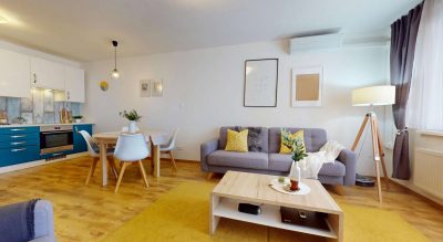 Interiér je pripravený na okamžité bývanie, pričom klimatizácia zabezpečí komfort počas horúcich letných dní. K bytu prislúcha aj balkón (4,55 m²), ktorý je prístupný zo spálne aj z obývačky a pivnica, ktorá poskytne dodatočný úložný priestor.