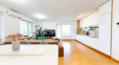 Podlahová plocha bytu je približne 85 m². Denná časť je svetlá, prirodzene prepojená s kuchynskou linkou so vstavanými spotrebičmi. Spálňová časť je doplnená o dve samostatné izby, z ktorých jedna má priamy vstup na terasu. Terasa je prístupná zo všetkých obytných miestností, čo bytu dodáva pocit otvorenosti a vzdušnosti.