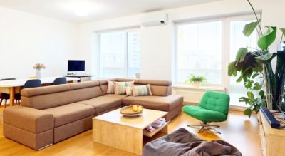 Interiér dopĺňajú dve kúpeľne, samostatná toaleta, šatník a klimatizácia. V kúpeľniach je použitá kvalitná veľkoformátová gresová dlažba v neutrálnych odtieňoch. Dispozícia vznikla úpravou pôvodného štvorizbového pôdorysu a je možné ju v prípade potreby upraviť späť.