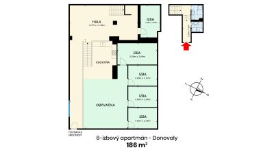 Len kúsok od zjazdovky na Donovaloch ponúkame na predaj výnimočný 6-izbový apartmán s podlahovou plochou 186 m², ktorý prešiel kompletnou a kvalitnou rekonštrukciou v apartmánovom dome Šafrán. Rozprestiera sa na troch podlažiach a spája moderné technológie, premyslenú dispozíciu a ticho, ktoré je v centre Donovál skôr raritou. Na vstupnom poschodí sa nachádzajú dve kúpeľne so sprchovacím kútom a toaletou, pričom jedna je doplnená o práčku so sušičkou. Stredné podlažie tvorí veľkorysý otvorený priestor s výmerou 54 m², ktorý môže slúžiť ako obývacia izba, pracovňa, herňa či čitáreň. Súčasťou tejto úrovne je aj samostatná spálňa. Dolné podlažie predstavuje hlavnú dennú časť apartmánu. Otvorený koncept kuchyne, jedálne a obývačky so stropom vysokým 4,4 metra vytvára príjemný, vzdušný priestor na rodinné stretnutia a oddych. V tejto časti sa nachádzajú štyri samostatné spálne, všetky vybavené posteľami a úložným priestorom, vhodné pre rodiny aj väčšie skupiny. Kuchyňa je plne vybavená kvalitnými spotrebičmi Bosch a kompletným príslušenstvom, pripravená na okamžité používanie. Komfort bývania zvyšuje kvalitná rekuperácia ovládateľná cez aplikáciu, centrálne kúrenie doplnené o elektrické podlahové kúrenie v spálňach, obývacej časti a kúpeľniach, ako aj dôkladná tepelná a zvuková izolácia, ktorá zabezpečuje príjemnú klímu a absolútne ticho. Bezpečnosť a praktickosť dopĺňajú vstupné dvere s inteligentným systémom Nuki na ovládanie cez mobil. Samozrejmosťou je vysokorýchlostný optický internet so sieťou DECO mesh, Apple HomePod a predpríprava na kamerový systém aj alarm. Svetlo do apartmánu prináša priesvitný a uzamykateľný anglický dvorec, ktorý zároveň poskytuje súkromie, priestor na odkladanie lyží a možnosť nabíjania elektromobilu. Apartmánový dom Šafrán ponúka recepciu počas pracovných dní, dostatok parkovacích miest, kamerový systém a upravené spoločné priestory. Donovaly patria medzi najobľúbenejšie celoročné horské destinácie na Slovensku a táto lokalita ponúka výborné podmienky na lyžovanie, turistiku aj rekreáciu. Apartmán disponuje podlahovou plochou 186 m², šiestimi izbami, dvomi kúpeľňami, priestrannou dennou časťou a modernými technológiami. Je kompletne zariadený, ihneď k dispozícii a vďaka svojej dispozícii dokáže komfortne ubytovať až 16 osôb.