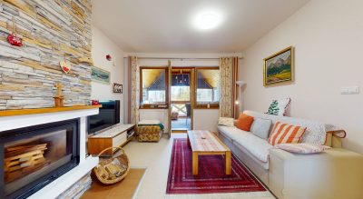 Apartmán sa nachádza na poschodí apartmánového domčeka a ponúka príjemné bývanie s dôrazom na komfort. Jeho veľkým benefitom je zastrešená a vykurovaná terasa – zimná záhrada, ktorá poskytuje nádherné výhľady na štíty Vysokých Tatier vrátane dominantného Lomnického štítu. Práve tento priestor vytvára ideálne miesto na relax počas celého roka, či už pri rannej káve alebo večernom oddychu.