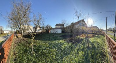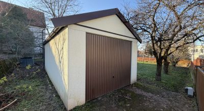 Na pozemku sa už nachádza garáž s diaľkovým ovládaním, ktorú dopĺňa elektrická vstupná brána, čo zvyšuje komfort aj bezpečnosť prístupu. Celkový charakter miesta príjemne dotvárajú ovocné stromy, poskytujúce prirodzené súkromie a atmosféru.