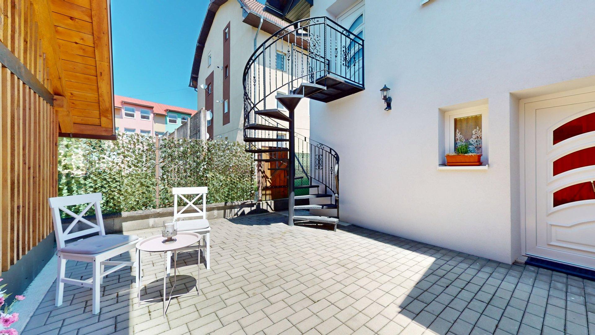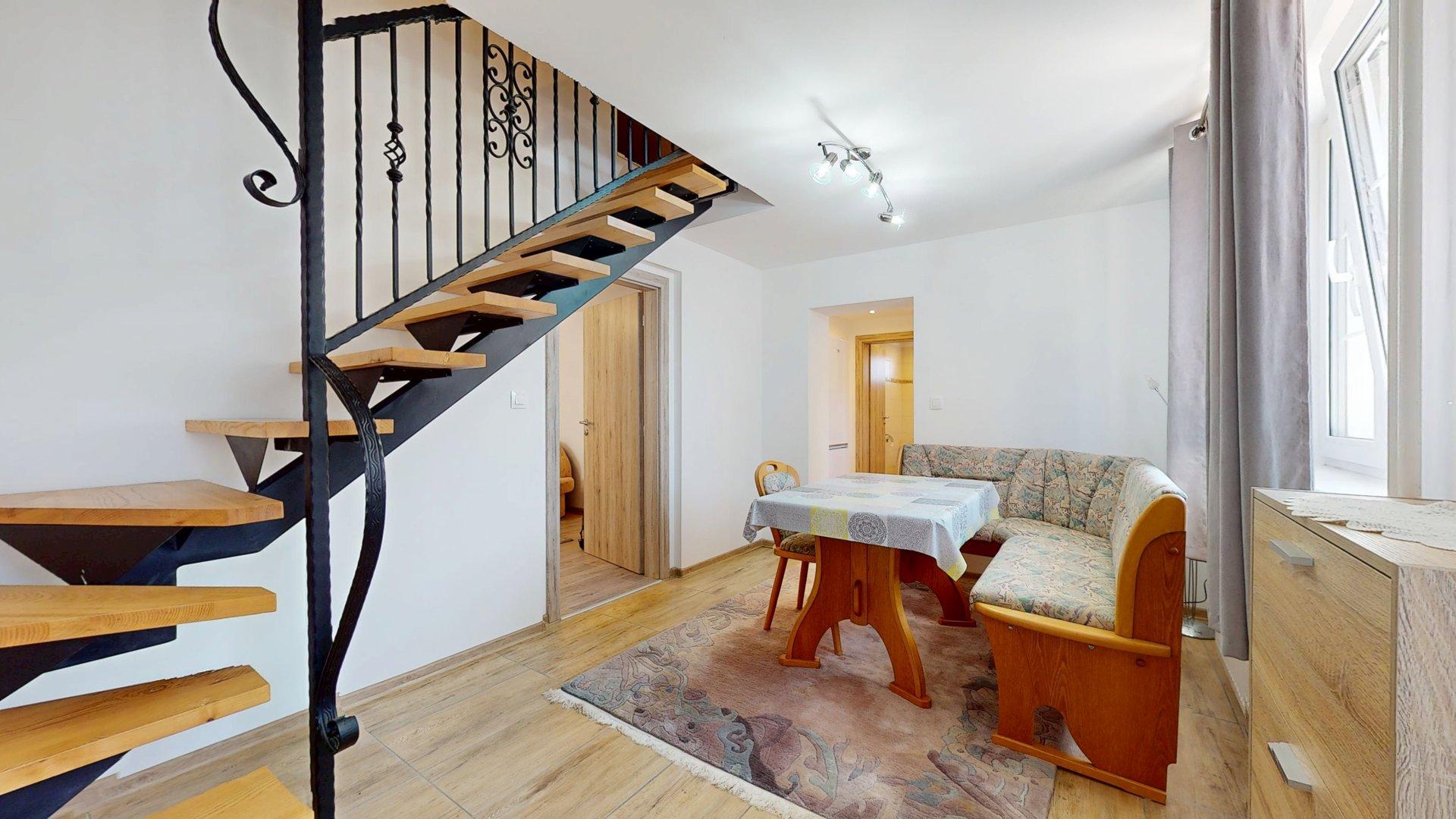 Druhá, 3-izbová časť, má aktuálne vlastný vchod na úrovni prvého poschodia, dostupný točitým schodiskom z terasy. Takže na prvom poschodí má dennú časť s obývačkou, jedálňou, kuchyňou a kúpeľňou. Z dennej časti sa schodiskom dostanete na druhé poschodie so spálňou, samostatným WC, úložnými priestormi a veľkým priestorom pre pracovňu alebo ďalšiu spálňu.