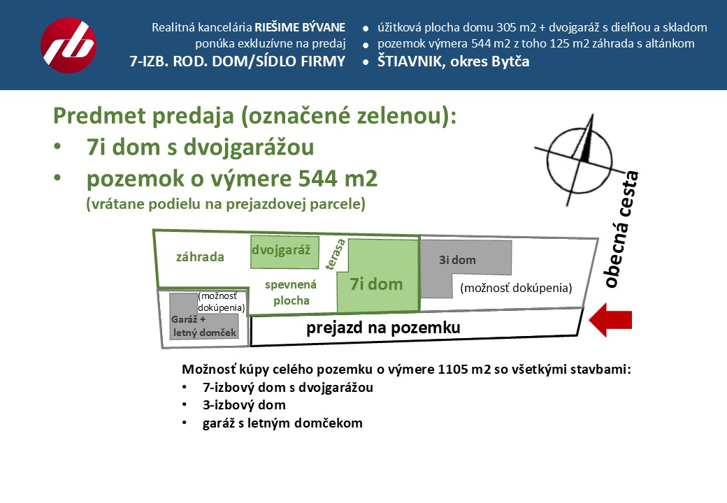 Dom s príslušenstvom je situovaný v zadnej časti väčšieho pozemku s podielovým vlastníctvom na spoločnej prejazdovej ceste. V prípade záujmu je možné dokúpiť k domu ešte jednu garáž s letným domčekom, alebo aj druhú časť pozemku s 3-izbovým domom, ktorý sa samostatne nepredáva.